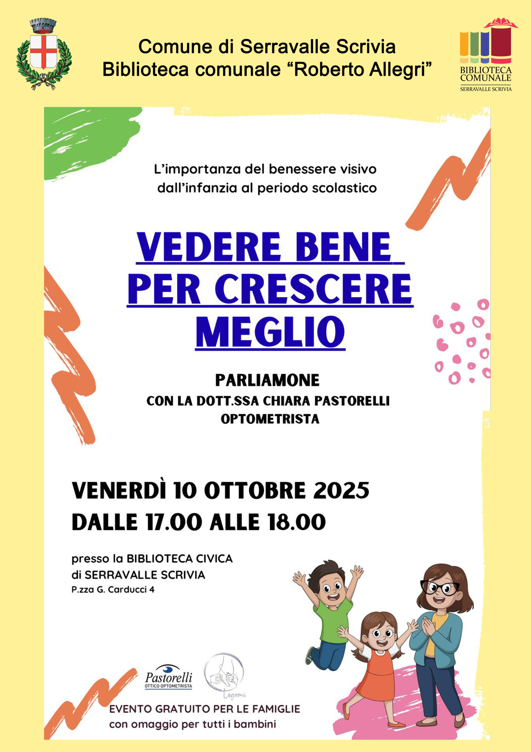 “Vedere bene per crescere meglio. Parliamone” con la Dott.ssa Chiara Pastorelli Optometrista, che si svolgerà venerdì 10 ottobre 2025 dalle 17.00 alle 18.00 presso la Biblioteca comunale “Roberto Allegri” di Serravalle Scrivia in Piazza G. Carducci 4. Un evento dedicato all’importanza del benessere visivo dall’infanzia al periodo scolastico. E’ organizzato dall’Associazione “Legami” di Novi Ligure, gratuito per le famiglie con omaggio a tutti i bambini. Vi aspettiamo!