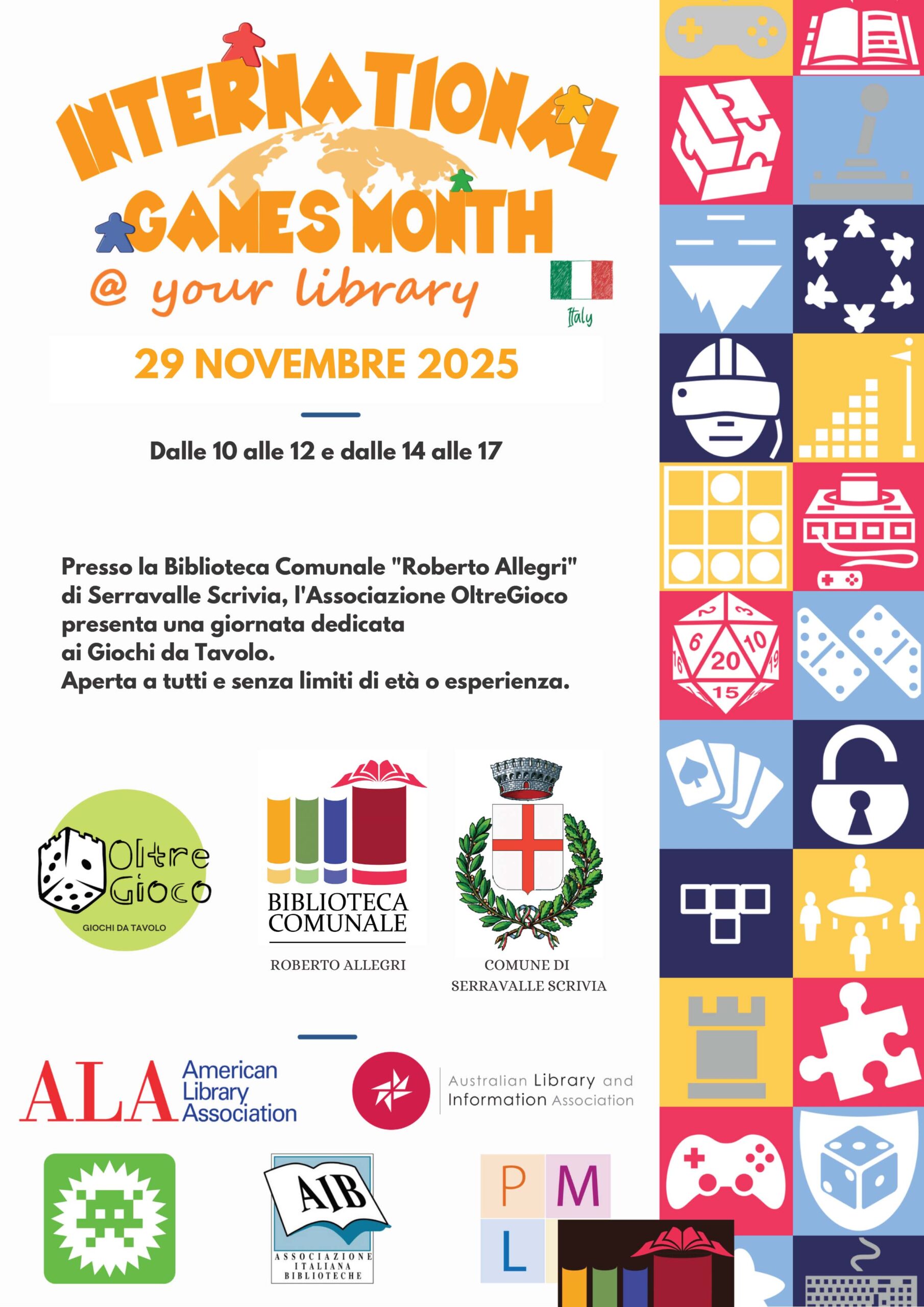 La Biblioteca di Serravalle Scrivia aderisce all’International Game Month @ Your Library, iniziativa internazionale promossa ogni novembre in Europa e negli Stati Uniti per valorizzare il gioco come strumento culturale, educativo e sociale.